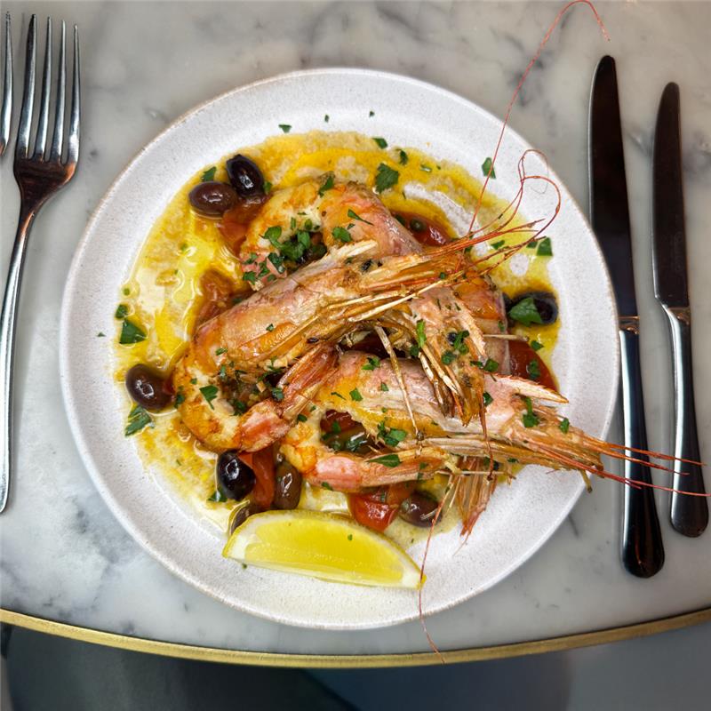 Wild red king prawns in a tomato, olive, chilli & anchovy sauce
